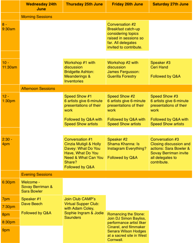 A four-hour, online workshop aimed at practitioners who have a project they would like to self-organise and direct. It was delivered for CAMP (Contemporary Art Membership Plymouth) a member-led network for the creative and visual arts community in Devon and Cornwall, including artists, producers, curators and arts writers. Join CAMP and get more information at www.camp-plymouth.org.